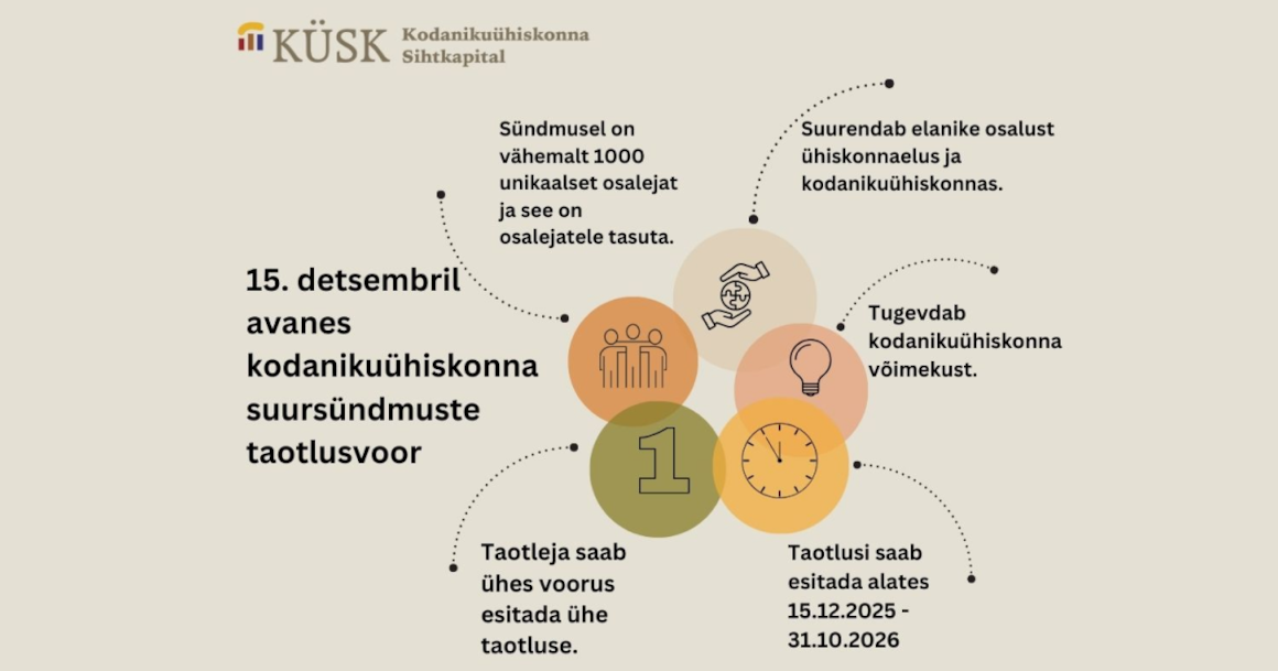 | KÜSK on avanud kodanikuühiskonna suursündmuste toetusvooru, mille eesmärk on toetada üle-eestiliste kodanikuühiskonna suursündmuste algatamist ja jätkumist. Toetus on suunatud sündmustele, mis toovad kokku erinevaid vabaühendusi, suurendavad elanike osalust ning aitavad tõsta kodanikuühiskonna nähtavust ja mõju. Loe toetusvooru kohta lähemalt KÜSKi kodulehelt siit. Toetust saavad taotleda mittetulundusühingud ja sihtasutused, kes tegutsevad avalikes huvides ja on olnud registris vähemalt ühe aasta. Toetatavad sündmused peavad olema avalikud, osalejatele tasuta, toimuma Eestis ning tooma kokku vähemalt 1000 unikaalset osalejat. Taotlusi saab esitada toetuste menetlemise infosüsteemis (TMS) KÜSKi kehtival taotlusvormil alates 15. detsembrist 2025 kuni 31. oktoobrini 2026. Toetusvooru eelarve kokku on 150 000 eurot ning ühe taotluse maksimaalne toetussumma on kuni 25 000 eurot. Vaata tingimuste kohta lähemalt siseministri määrusest nr 37 „Kodanikuühiskonna suursündmuste toetuse andmise tingimused ja kord“. Taotlusi hinnatakse sündmuse vajalikkuse ja mõju, taotleja võimekuse, tegevuste läbimõelduse ning meeskonna pädevuse alusel. |