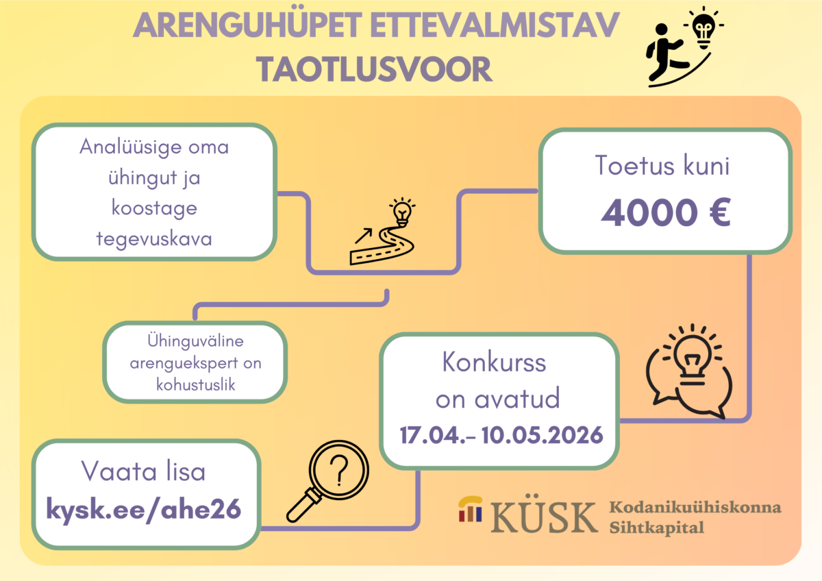 Kodanikuühiskonna Sihtkapital (KÜSK) avas täna, 17. aprillil 2026 vabaühenduste arenguhüpet ettevalmistava taotlusvooru eelarvega 45 600 eurot.